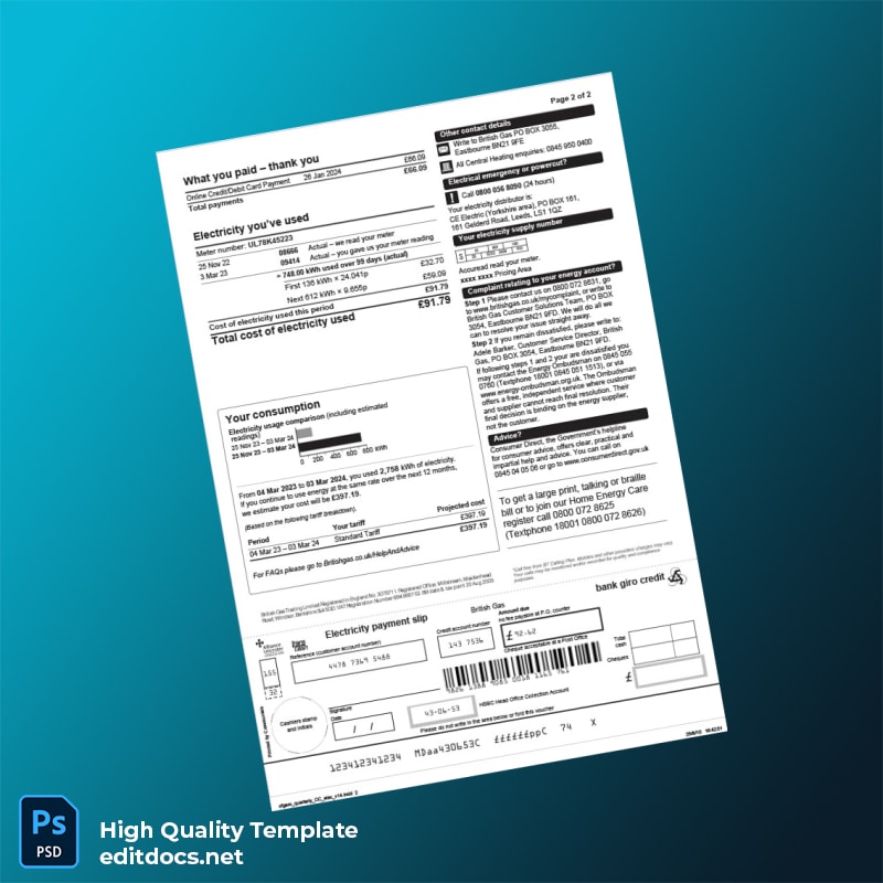 Discover a professional and customizable solution with the United Kingdom British Gas Trading Ltd Editable Electricity Bill Template available in Word and PDF formats. This expertly designed template serves as a practical utility bill proof of address template, enabling swift editing and instant professional use for individuals and businesses requiring valid, editable documentation.