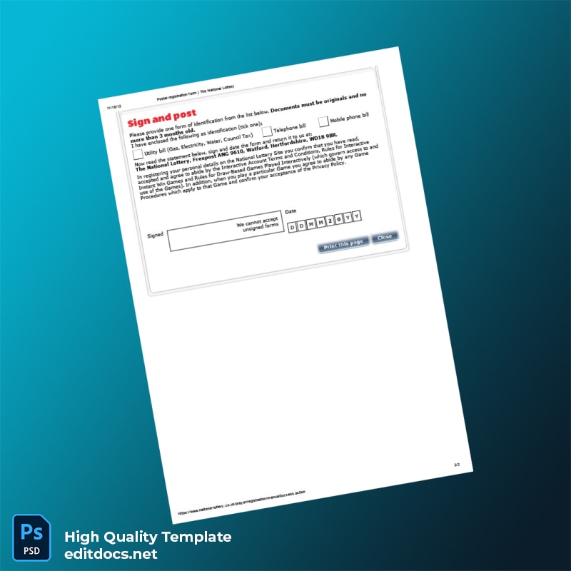 United Kingdom The National Lottery Editable Postal Registration Form Template in Word and PDF formats 2 page