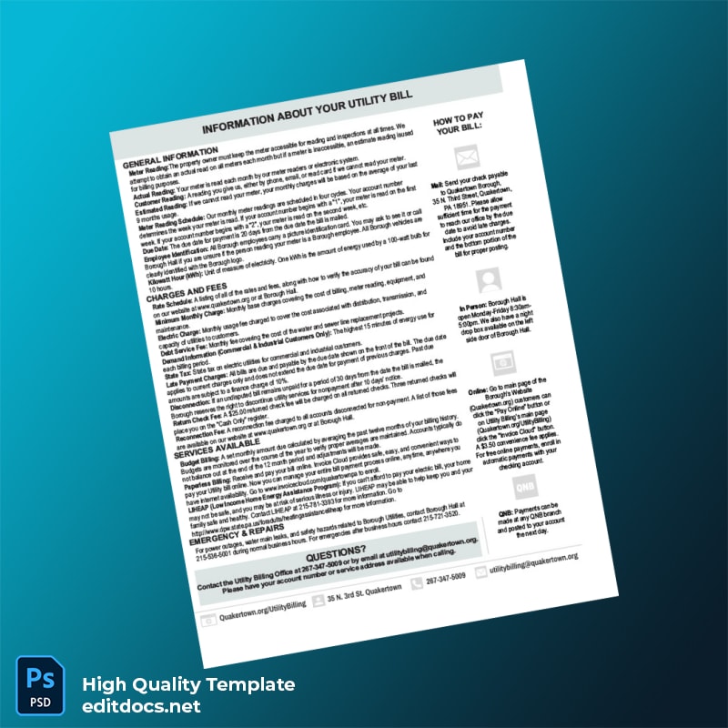 Don’t let missing or expired utility bills disrupt your official processes. Download the United States Borough Of Quakertown Editable Utility Bill Template in Word and PDF formats today and take control of your documentation needs. Explore more options from the same category to find the best fit for your unique requirements by visiting utility bill templates.
