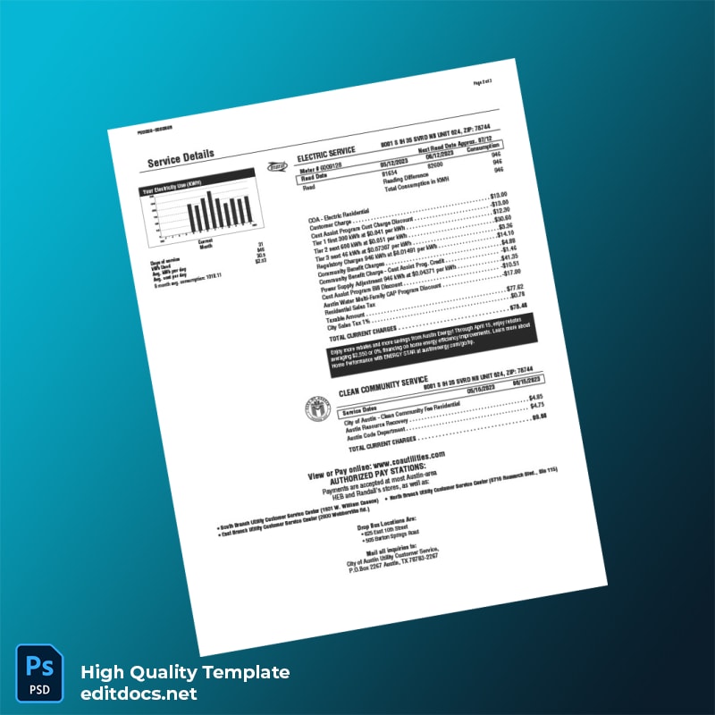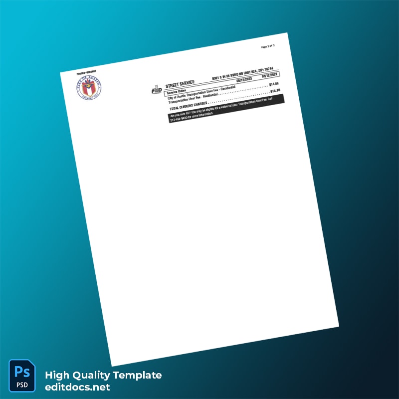 This editable utility bill template provides a professional and reliable solution for creating authentic-looking proof of address documents. Available in both Word and PDF formats, this United States City of Austin utility bill template is designed to help professionals quickly replace lost, stolen, or expired utility bills with ease and accuracy.