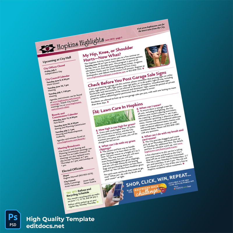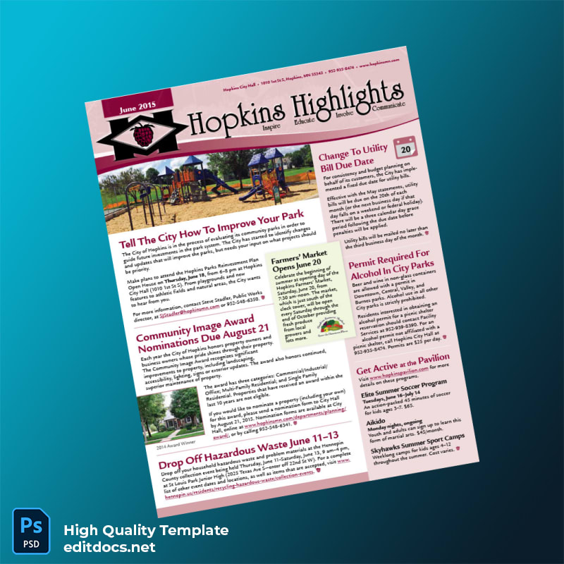United States City Of Hopkins Editable Community Newsletter Template in Word and PDF formats