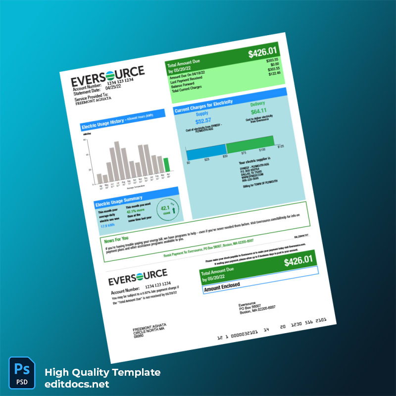The United States Eversource Editable Electricity Bill Template provides a professional and easy-to-use solution for quickly producing authentic-looking utility bills. Available in both Word and PDF formats, this template is ideal for individuals and professionals needing a reliable utility bill proof of address template. Its fully editable features make it a versatile tool for creating customized documents that are accurate and ready for immediate use.