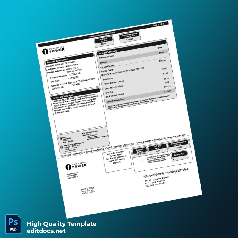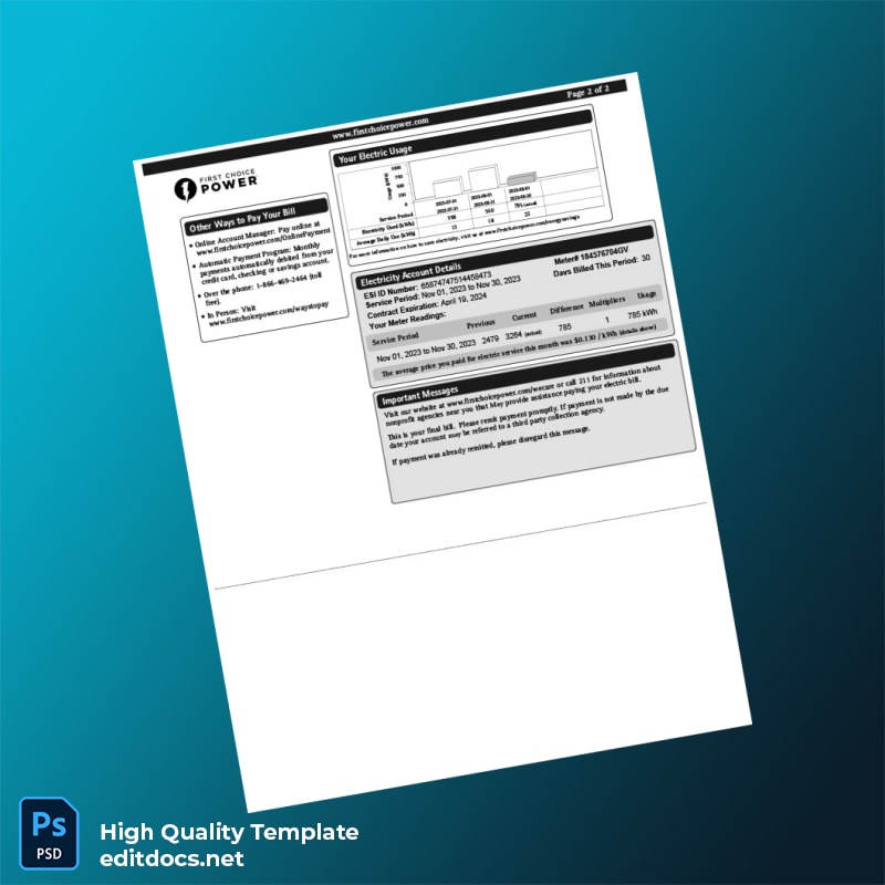 The United States First Choice Power Editable Electricity Bill Template offers a versatile and professional solution for generating authentic-looking utility bills in both Word and PDF formats. Designed for individuals and professionals who need a reliable proof of address document, this template combines full customizability with ease of use, supporting quick editing and seamless digital or physical submission.