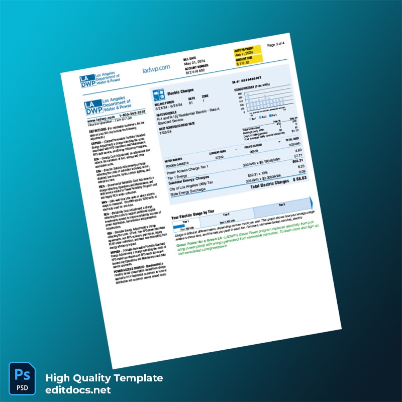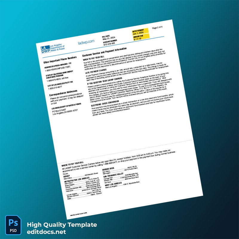United States Los Angeles Department Of Water And Power Editable Utility Bill Template in Word and PDF formats 4 page
