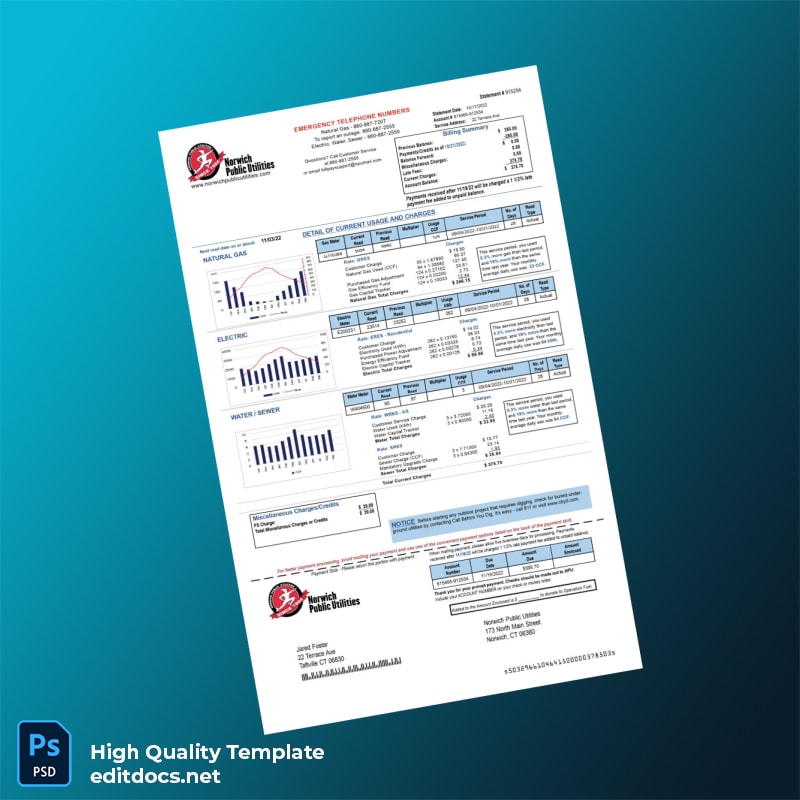United States Norwich Public Utilities Editable Utility Bill Template – Professional Utility Bill Proof of Address Solution