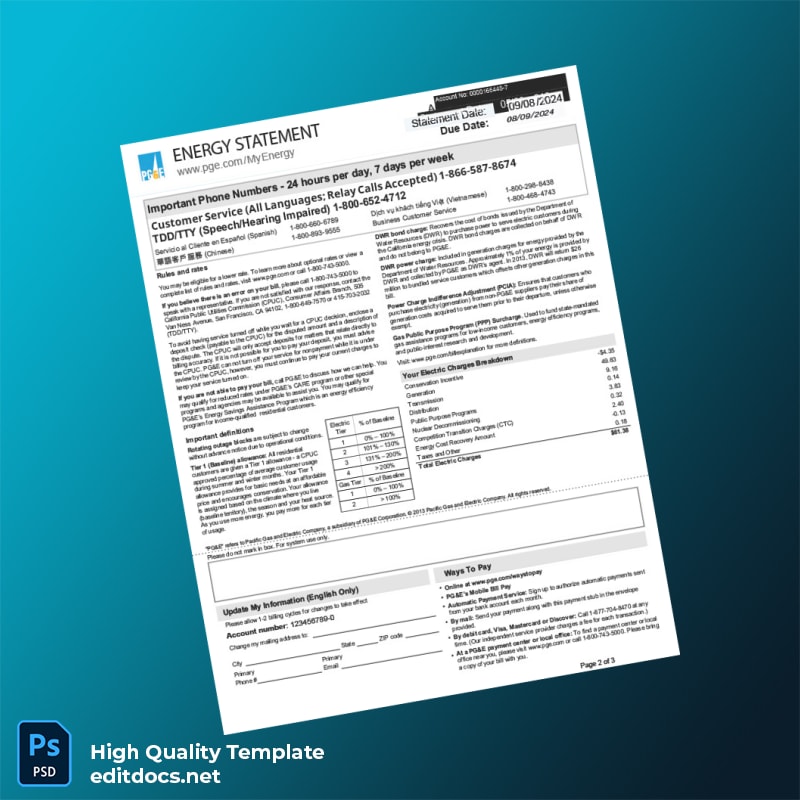 Conveniently create authentic-looking utility bill documents with the United States Pacific Gas And Electric Company Editable Bank Statement Template. Available in both Word and PDF formats, this versatile template serves as a reliable utility bill proof of address template for professionals needing quick and editable solutions. Whether you require an editable utility bill template word or an editable utility bill template pdf, this product ensures seamless customization and immediate access.