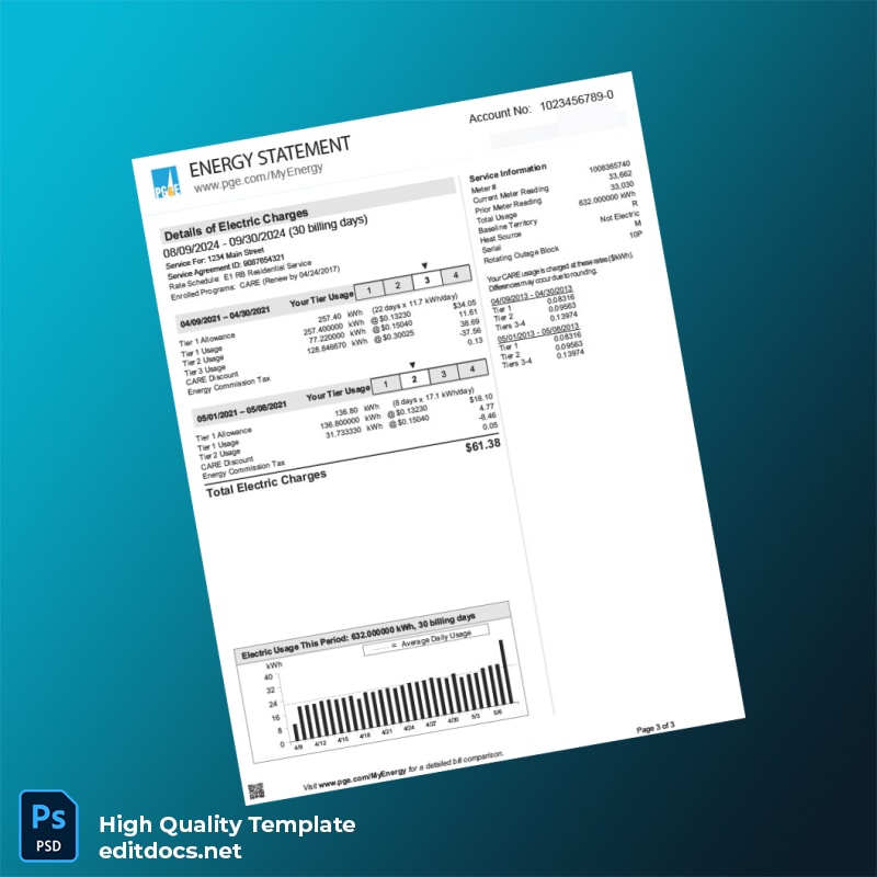 United States Pacific Gas And Electric Company Editable Bank Statement Template in Word and PDF formats 3 page
