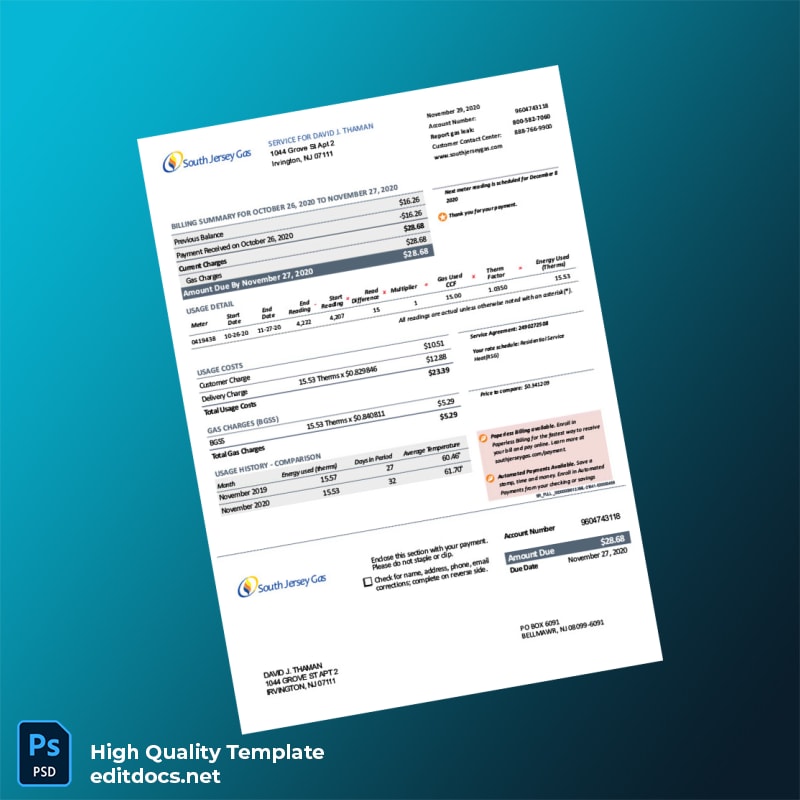 United States South Jersey Gas Editable Utility Bill Template in Word and PDF Formats
