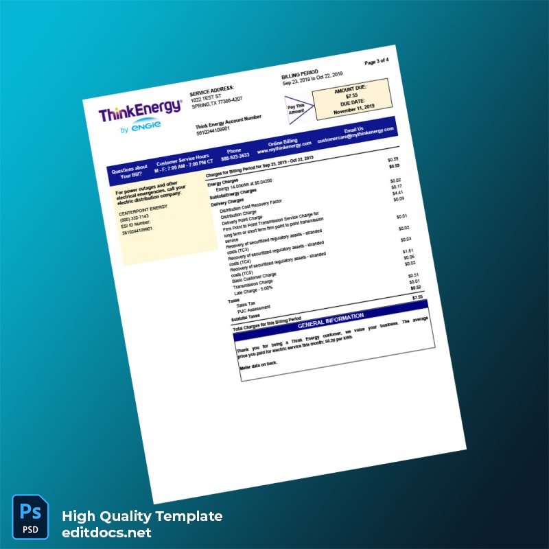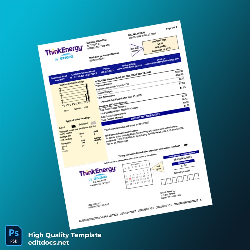 Efficiently create a professional and authentic utility bill proof of address with the United States Think Energy Editable Utility Bill Template. Available in both Word and PDF formats, this versatile template empowers professionals worldwide who need a reliable, customizable solution for proof of residence, billing documentation, or verification purposes.