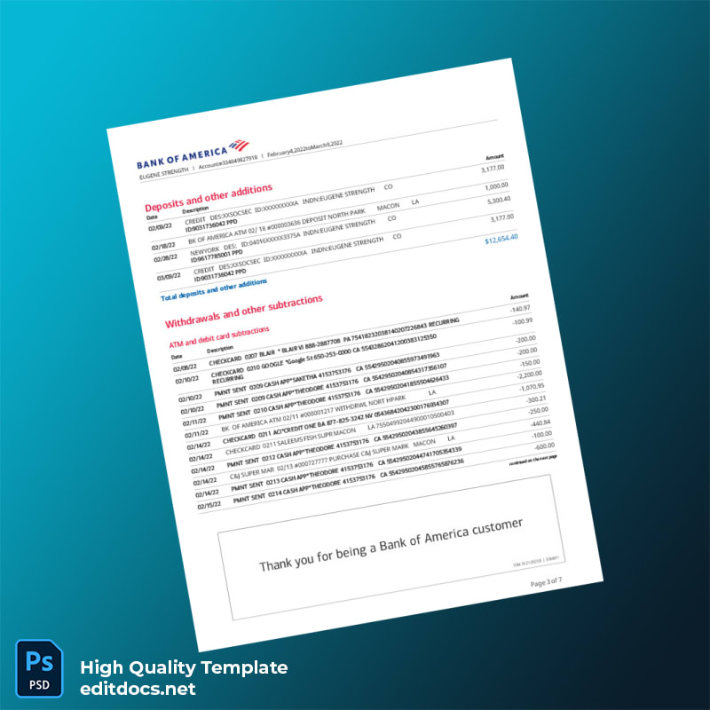USA Bank of America Account Statement Template in Word and PDF formats 7 page