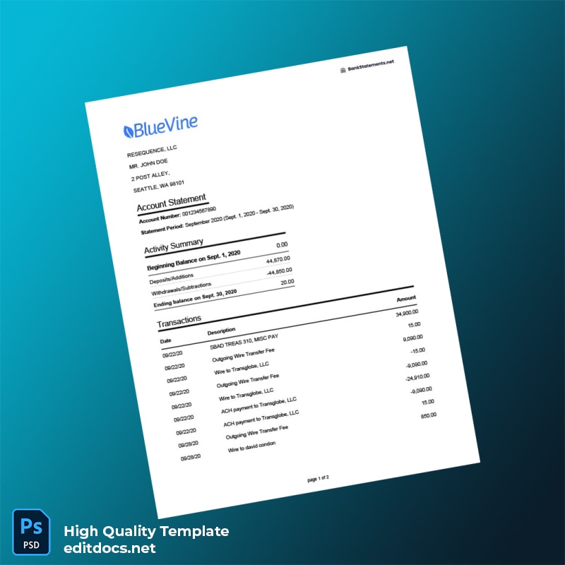 USA Bluevine Bank Statement Template in Word and PDF formats 2 page