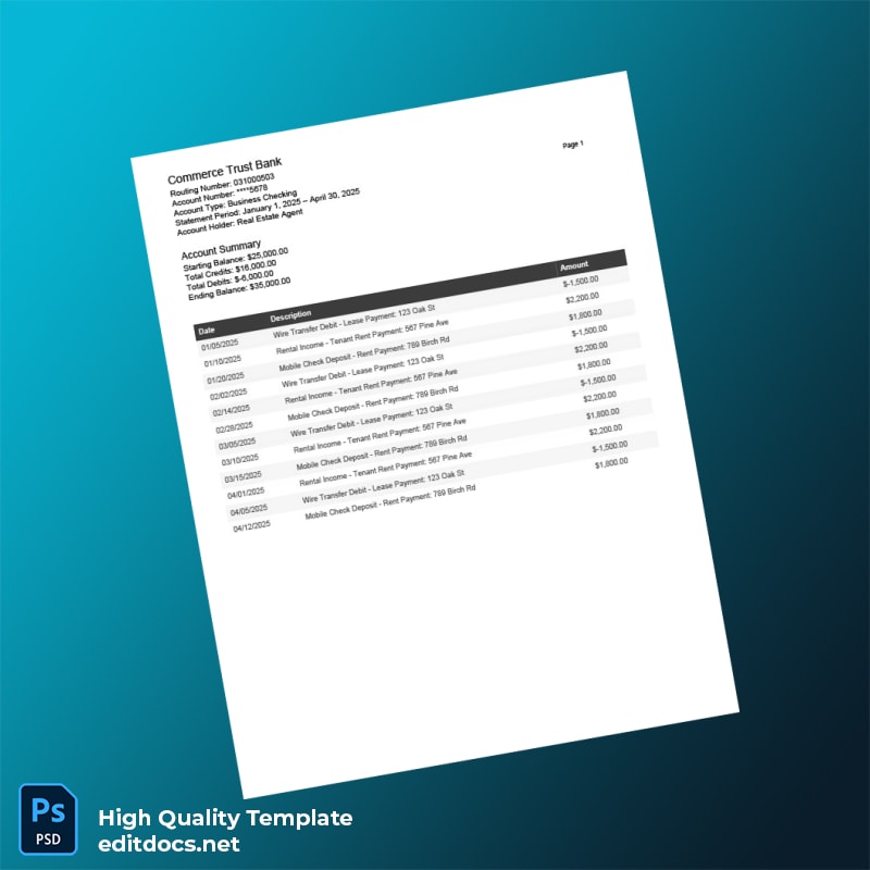 Introducing the USA Commerce Trust Bank Statement Template: your reliable solution for creating professional-grade bank statements in both Word and PDF formats. Perfect for creative and technical professionals alike, this template ensures quick access to editable bank statements tailored to your needs.