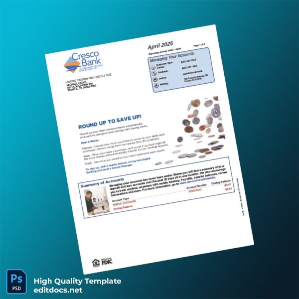 Don’t let missing or outdated bank statements delay your processes any longer. Order your USA CrescoBank Account Statement Template today and experience the ease of having professionally produced documentation ready in minutes! For additional templates and options, check out Bank Statement Templates for even more alternatives tailored to your needs.