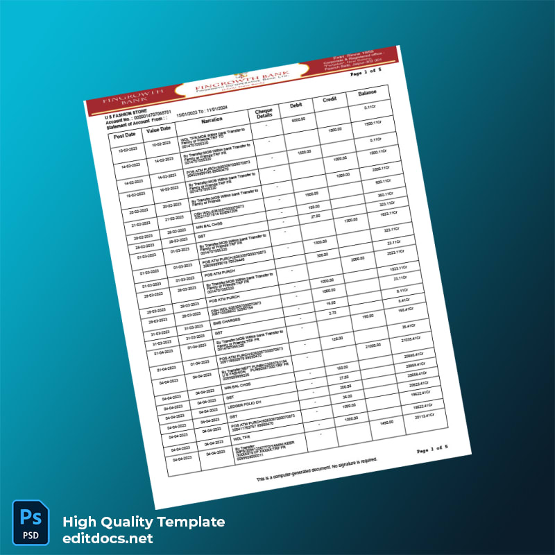 USA Fingrowth Bank Statement Template in Word and PDF formats 5 page