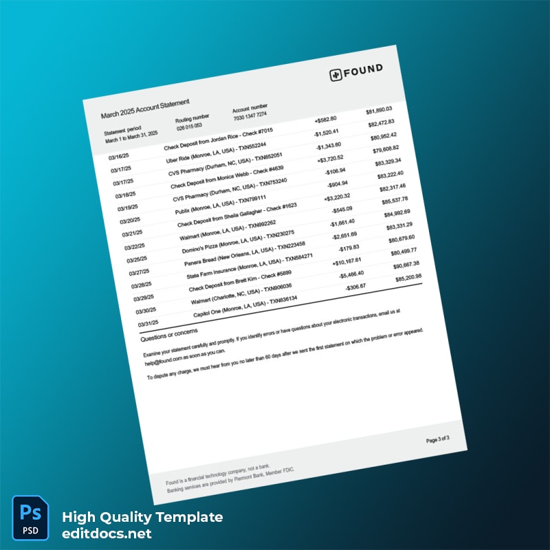 Need a quick and reliable solution for obtaining a professional bank statement? Our USA Found Bank Statement Template allows you to create a fully editable document in both Word and PDF formats, providing the flexibility and convenience that today’s professionals require.