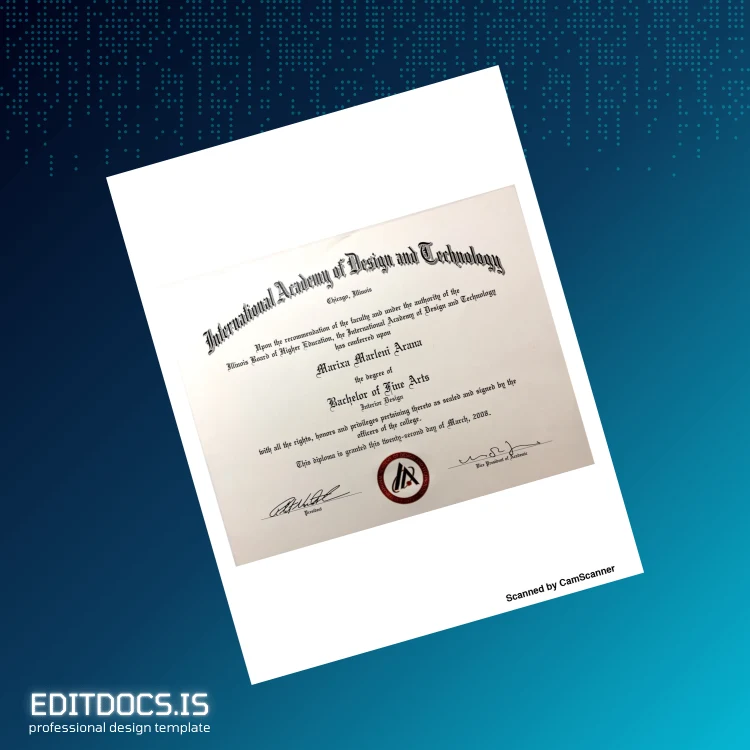 Experience the ease of customizing your academic credentials with the USA International Academy of Design and Technology Bachelor of Fine Arts in Interior Design Template in both Word and PDF formats. This digital diploma template provides a seamless solution for professionals needing a high-quality, editable diploma form. Whether you require a replacement diploma copy or a novelty diploma design for personal use, this template ensures flexibility and professional presentation. Explore more editable diploma templates at editable diploma template for additional customization options.
