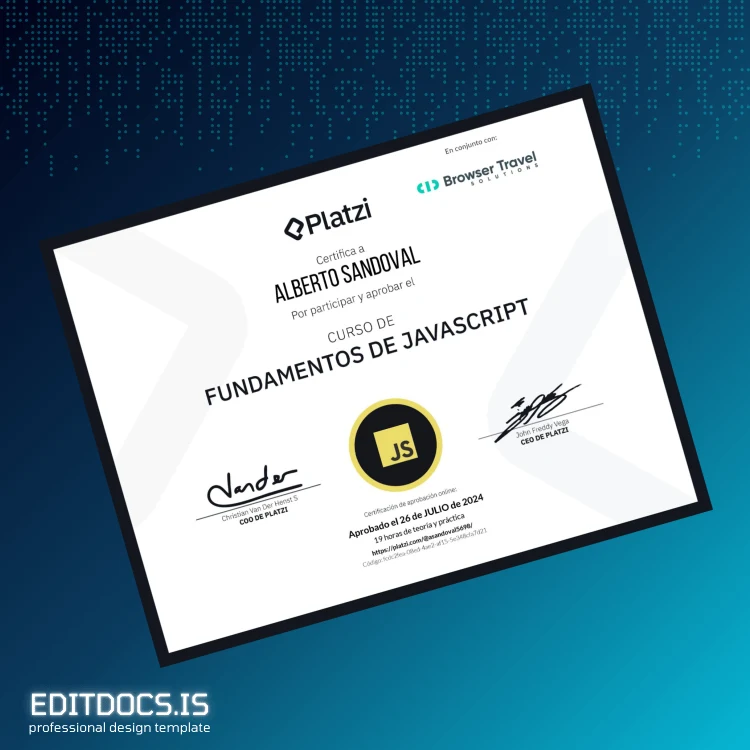 Transform your certificate needs instantly with this editable and customizable USA Platzi Fundamentals of JavaScript Certificate Template, available in both Word and PDF formats. Designed for quick editing and professional presentation, this template suits anyone needing a reliable replacement diploma form or a novelty diploma design for personal or educational purposes. To explore more options, visit the Editable Diploma Template category to discover additional customizable degree templates that fit your requirements perfectly.