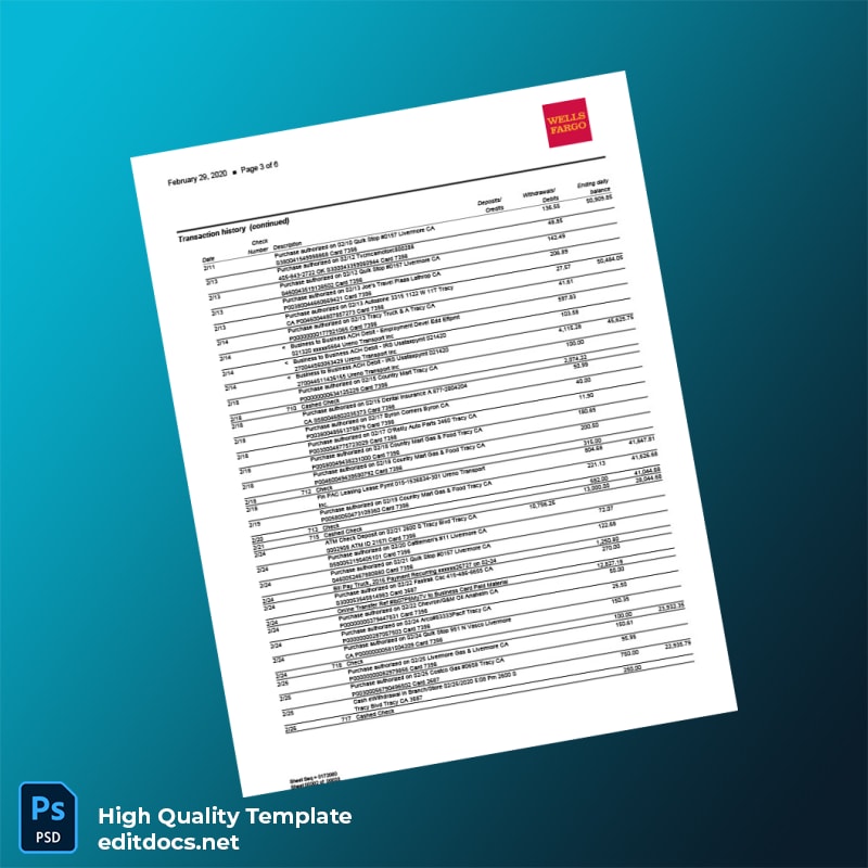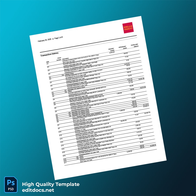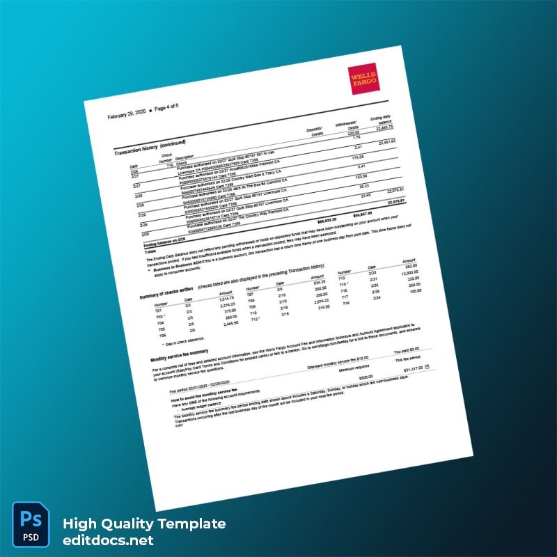 Don’t let missing documents hinder your progress. Order the USA Wells Fargo Bank Statement Template today, and gain quick, reliable access to your crucial financial details, whether it’s for applying for loans, securing a rental, or any situation requiring official financial proof. Elevate your professional image now!