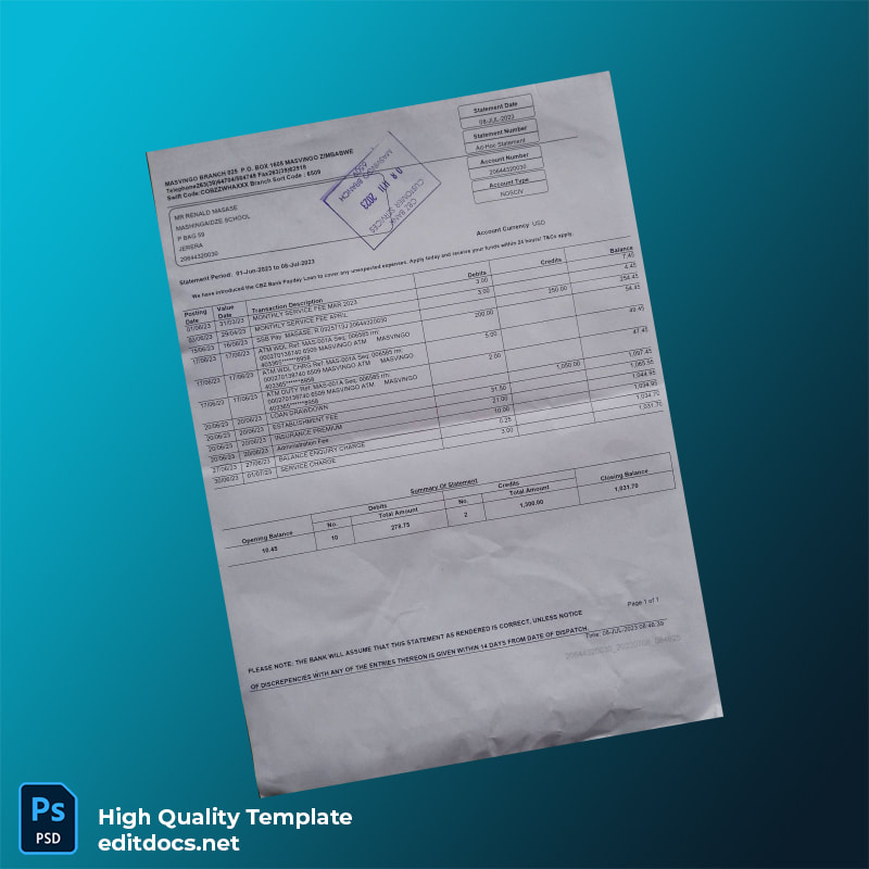 Zimbabwe CBZ Bank Statement Template in Word and PDF formats